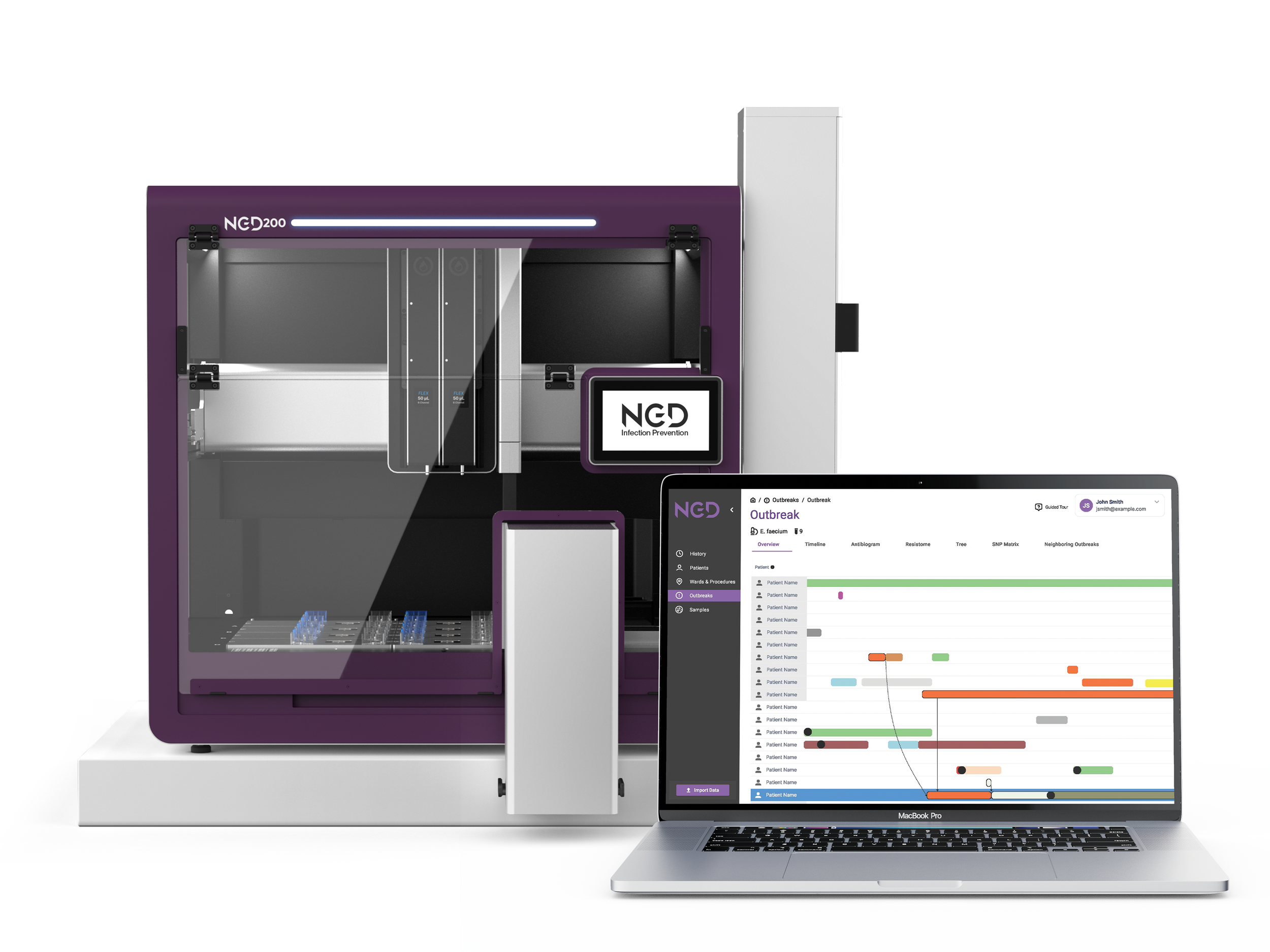It empowers staff to rapidly identify infection sources and contain outbreaks with efficiency by leveraging our automated sample preparation, low-cost WGS, bioinformatic analysis, and intuitive user interface.